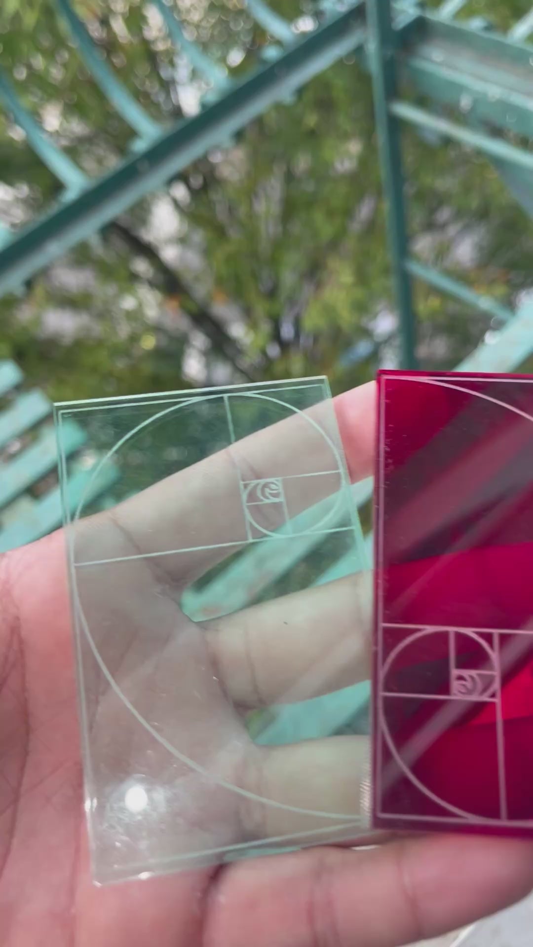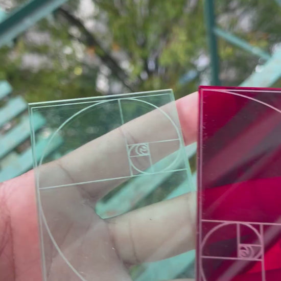 Laser-engraved motif of the Fibonacci Spiral and PIT//STOP symbol on red and teal acrylic.