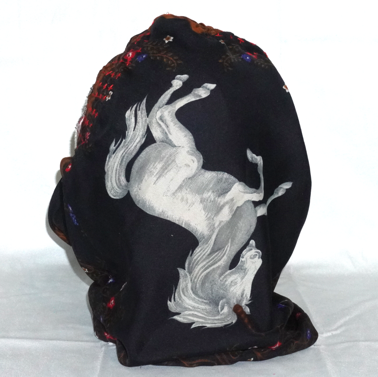 The piece features a black and red trucker cap embroidered with “Shatter Racing” across the front, with a vintage printed scarf sewn directly onto the cap, creating a striking layered silhouette that drapes and ties around the neck. The scarf’s intricate patterning — floral details and a rearing horse motif — transforms the structure of the hat into something sculptural and kinetic.