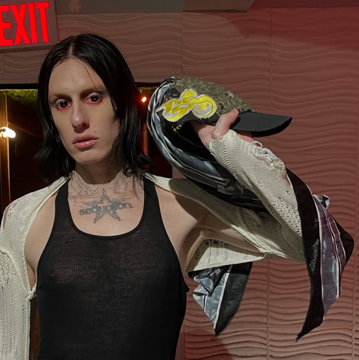 Handcrafted by Riac Oseph, this one-of-one upcycled trucker hat reimagines thrifted materials through raw texture and sculptural layering. The piece features a black adjustable cap wrapped with a vintage floral scarf, sewn directly into the structure of the hat for a hybrid silhouette that merges headwear and drapery. Distressed patchwork, visible hand-stitching, and a bold yellow emblem lend the piece a lived-in futurism — a wearable relic that blurs line between fashion artifact and club armor.