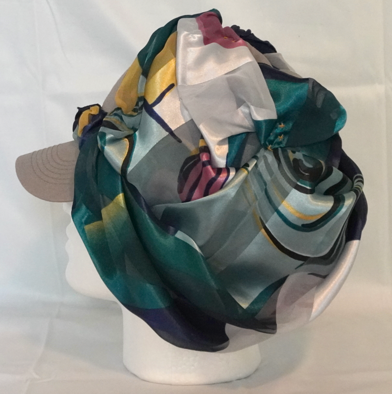 Handmade by Riac Oseph in London, England, this one-of-one upcycled trucker hat reinterprets thrifted materials through sculptural form and texture. A taupe cap featuring a distressed blue PIT//STOP patch is entwined with a multicolor silk scarf, hand-twisted and sewn into the hat’s structure for a hybrid silhouette that merges headwear and art object. Each piece carries traces of its previous life — visible stitching, worn textiles, and a raw finish that make every hat uniquely alive.