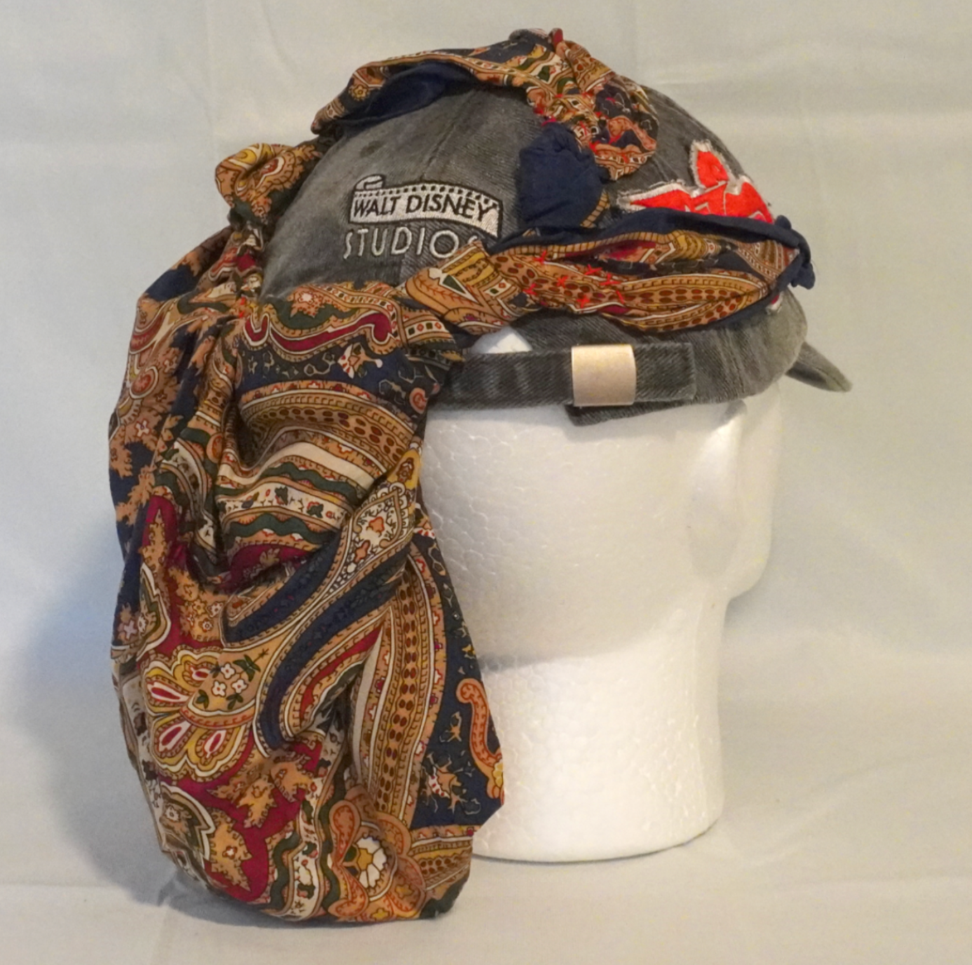 Handcrafted by Riac Oseph in London, England, this 1/1 upcycled trucker hat reinterprets a gray Walt Disney Studios cap into a sculptural, bohemian statement. A vintage paisley-print scarf in deep navy, gold, and red tones is hand-sewn into the crown, forming a voluminous drape that cascades behind the head. The piece merges Americana nostalgia with intricate textile layering, embodying Riac’s ongoing dialogue between functionality, fantasy, and revival.