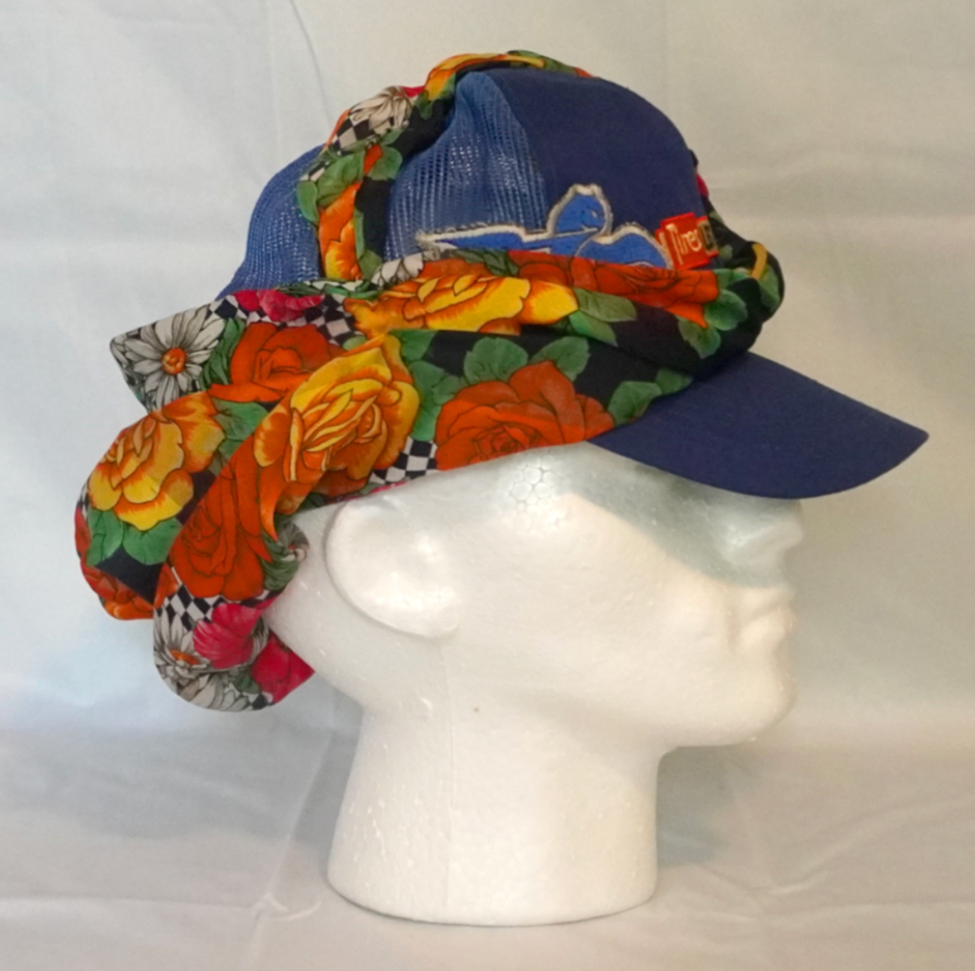 Handmade in London, England by Riac Oseph, this 1/1 upcycled trucker hat transforms a blue Les Schwab Tires cap into a vivid, sculptural piece of wearable art. A bold floral scarf featuring red, orange, and yellow roses intertwines with a black-and-white check pattern, wrapping around the mesh crown and cascading organically. The result is a striking balance between utility and ornament, Americana and decadence — where the industrial spirit of a roadside cap meets the romantic chaos of vintage textile.