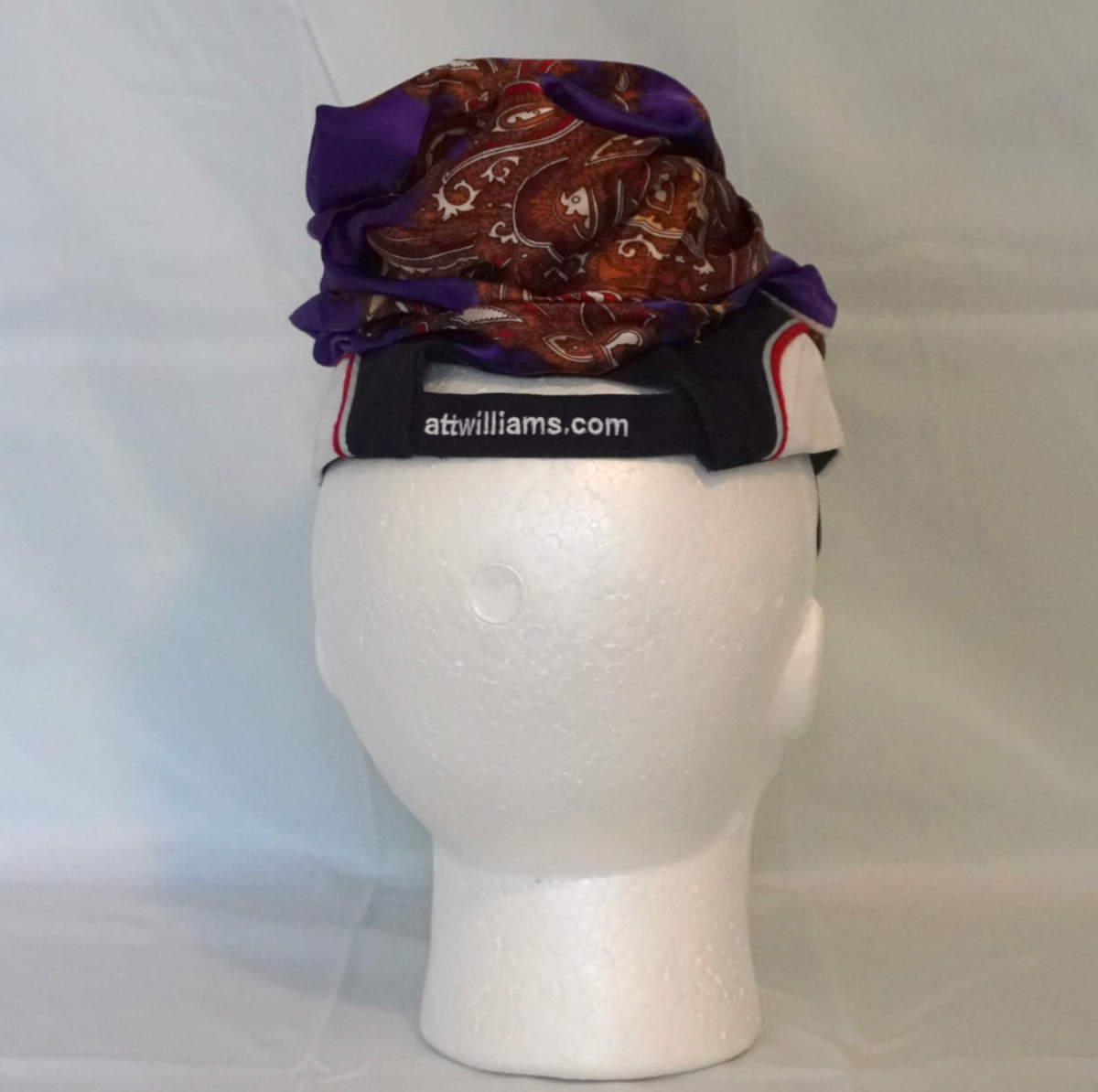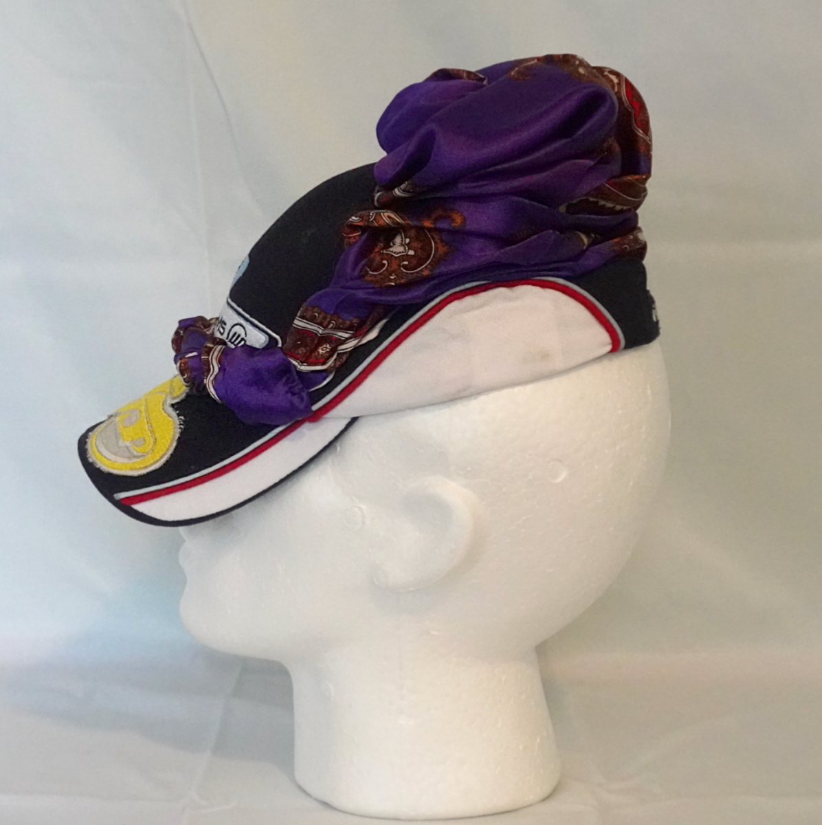This 1/1 upcycled trucker hat by Riac Oseph reimagines a classic Formula 1 relic into an object of sculptural couture. Centered on an original AT&T Williams Racing cap, the piece incorporates a richly detailed silk scarf in deep violet and brown paisley tones — braided and twisted through the crown to form a regal, crown-like shape. The yellow PIT//STOP patch at the brim injects a sense of raw street energy, contrasting the tailored opulence of the draped silk. This composition reflects Riac Oseph’s recurring dialogue between motion, excess, and reclamation.